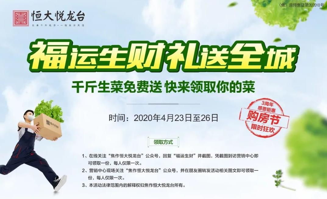 1.在线关注“焦作恒大悦龙台”公众号,回复“福运生财”并截图,凭截图到访营销中心即可领取一份,每人仅限一次。